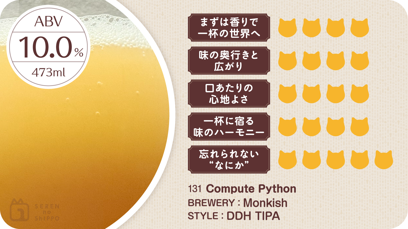 リッチで濃厚、そしてアルコール感も頼もしいTIPA。時間が経つほど甘味がふくらみ、ゆっくりと味変を楽しめるのも魅力です。濃厚系が好きな方、特にMonkish好きならぜひ体験してほしい一本。