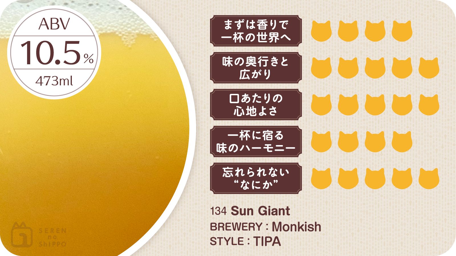 悩みに悩んで手に取ったMonkishのラインナップ。そのなかで気がつけば最後に残ったのが「Sun Giant/スタイル:TIPA」。無意識に“ラスイチ”にしていたあたり、何か特別な存在を感じさせます。名残惜しさとワクワクを胸に、いざ開栓!