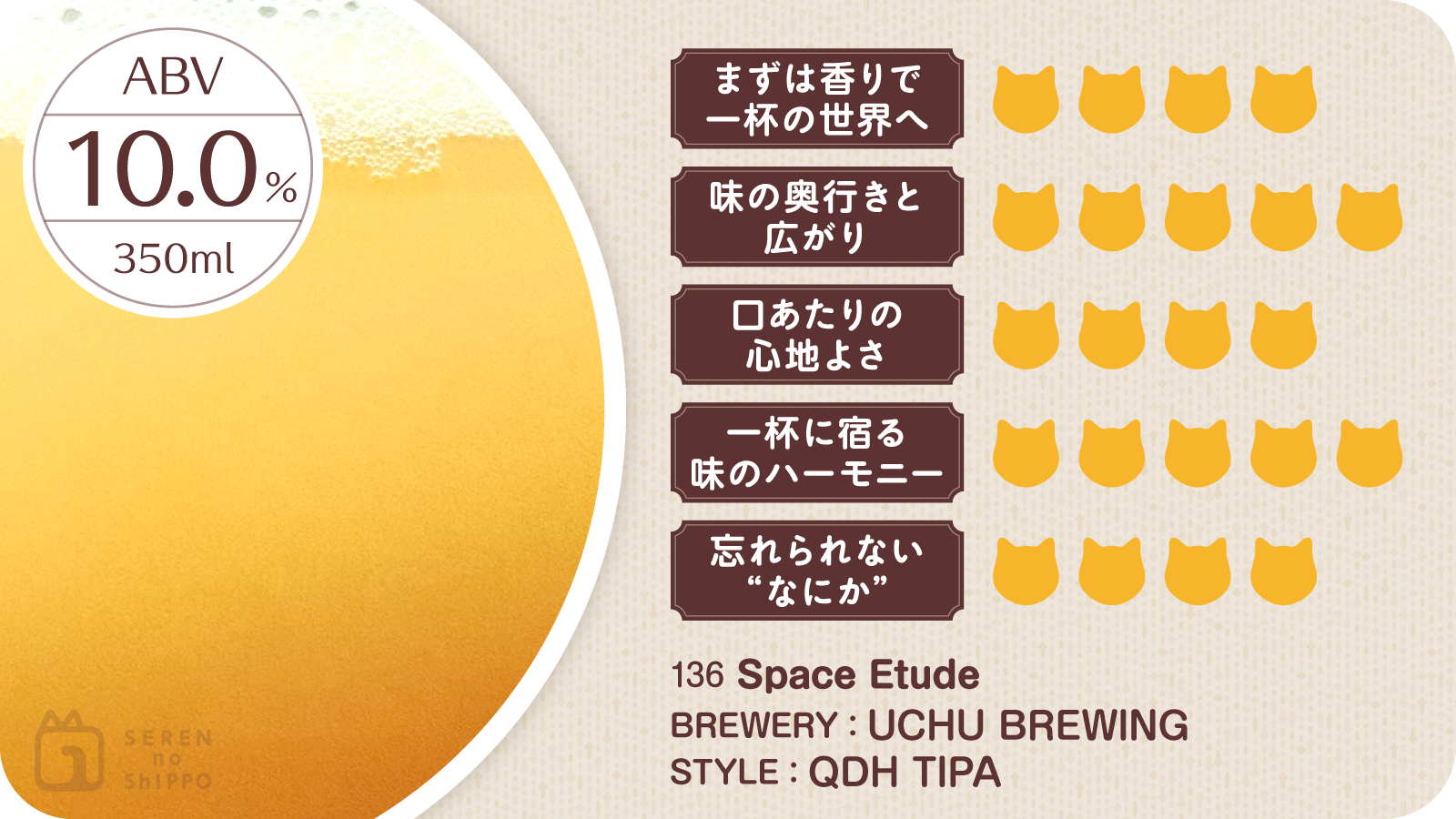 ハイアルながら重さを感じさせず、アルコールの余韻と苦味がきれいに残るドライな締めくくり。濃厚でジューシーなのに、最後はすっと引くキレの良さが印象的です。飲みごたえの中に感じる軽やかさが心地よく、一杯で“宇宙”を旅したような満足感を残してくれます。濃厚Hazyを愛する人にこそ味わってほしい1本。