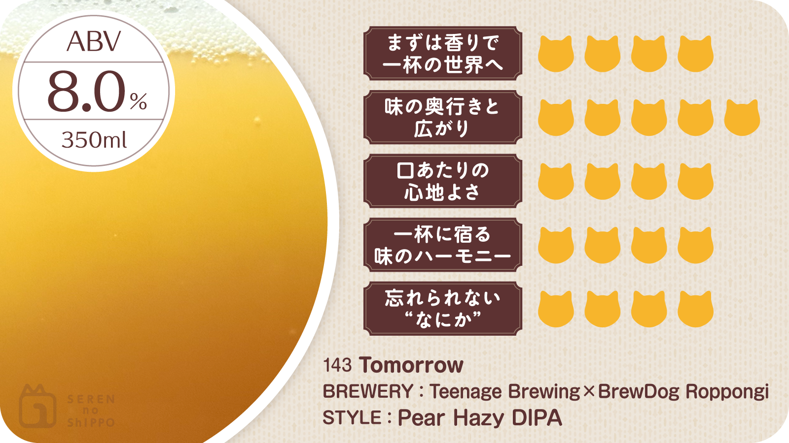 とともに増していく洋梨の余韻が印象的で、濃厚ながらじっくり楽しめる飲みごたえ。Teenage Brewing × BrewDog Roppongi が仕掛ける果実系Hazy DIPA!Hazy IPA好きはもちろん、梨好きにもぜひ試してほしい一本です。