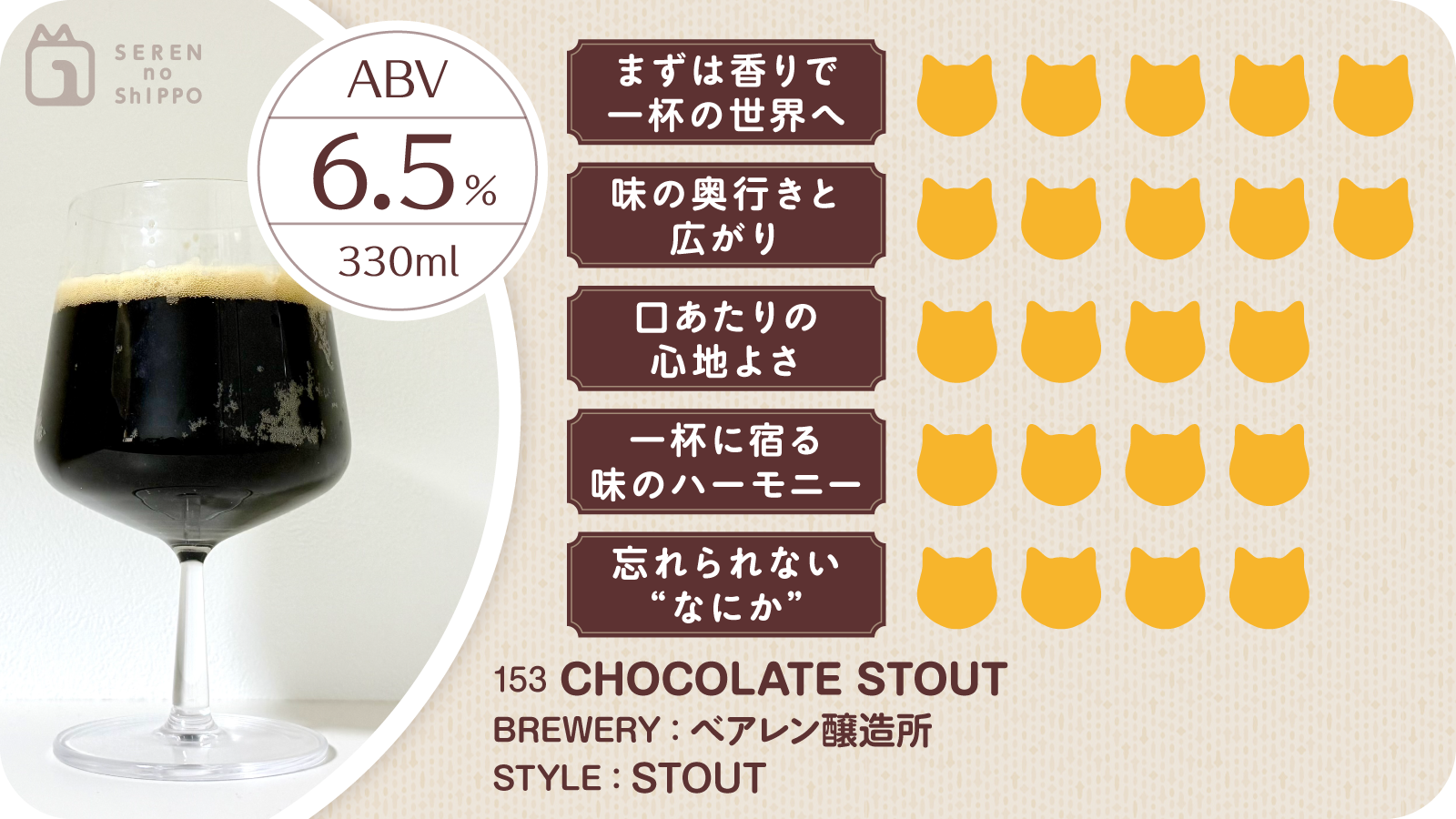 老舗の酒屋で選んだ一本。年明けに虎ノ門で飲んだUCHUのスタウトが頭から離れず、今回はほとんど迷わず決まりました。タップでは黒ビールを飲むことはあっても、思い返してみるとテイクアウトで選ぶのは意外と久しぶり。そんなことに気づきつつ、手に取ったのが ベアレン醸造所 のCHOCOLATE STOUT(チョコレート・スタウト)/Stout です。重たすぎず、でもスタウトらしさはきちんと感じられそう。静かな期待を抱きながら、ゆっくりグラスに注ぎました。