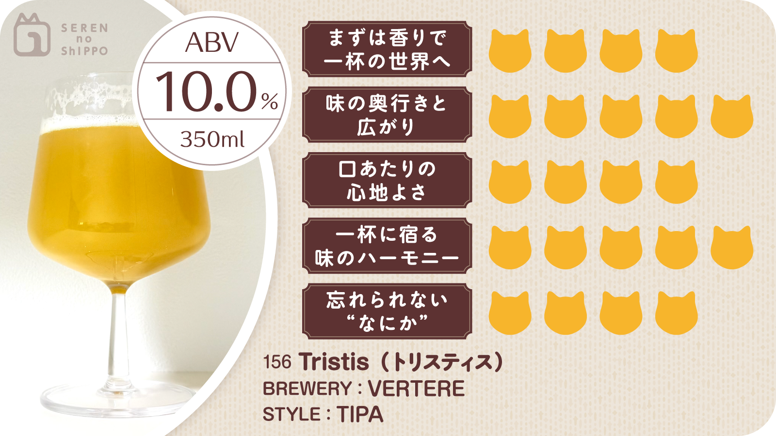 慌ただしかった日々が落ち着いた夜、冷蔵庫に残しておいた一本をようやく開けました。老舗酒屋で見つけたときから気になっていたVERTEREのTristis。ハイアルのTIPAなので、「今日はゆっくり飲める」という日に取っておいたビールです。グラスを用意する時間さえ、どこか少しだけ特別に感じました。