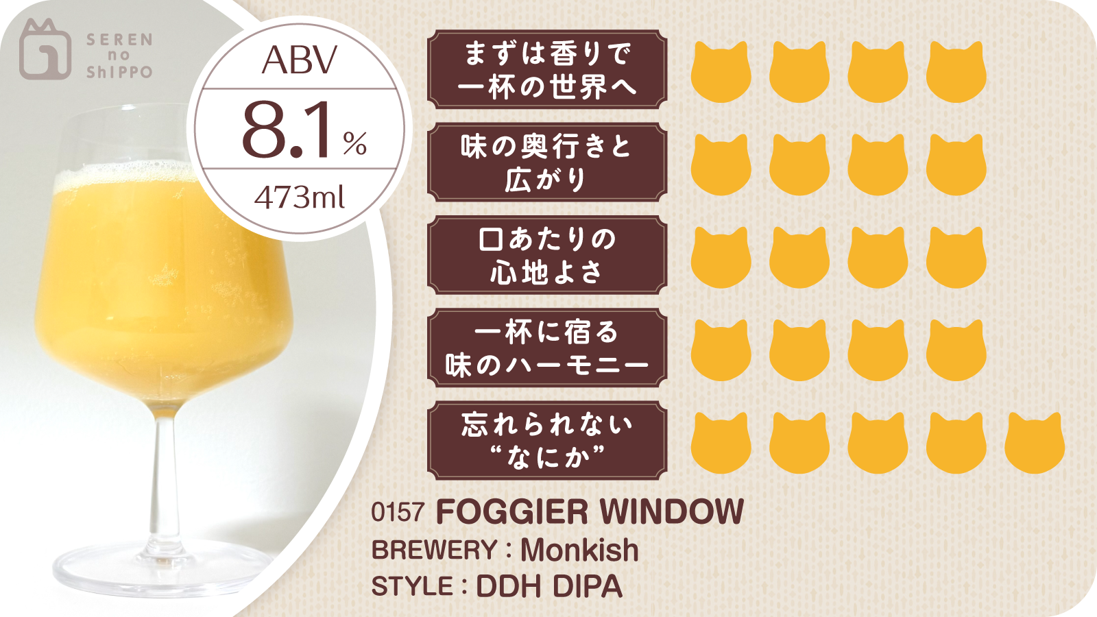 冷蔵庫から取り出した瞬間、濁りのあるイエローが目に飛び込んできました。果肉を思わせるその色合いに、思わず期待が膨らみます。ホップを贅沢に使うことで知られるMonkishですが、この一本もまた“間違いないだろう”と感じさせてくれる佇まい。違った意味で嬉しくなる、静かな高揚感を伴った出会いでした。