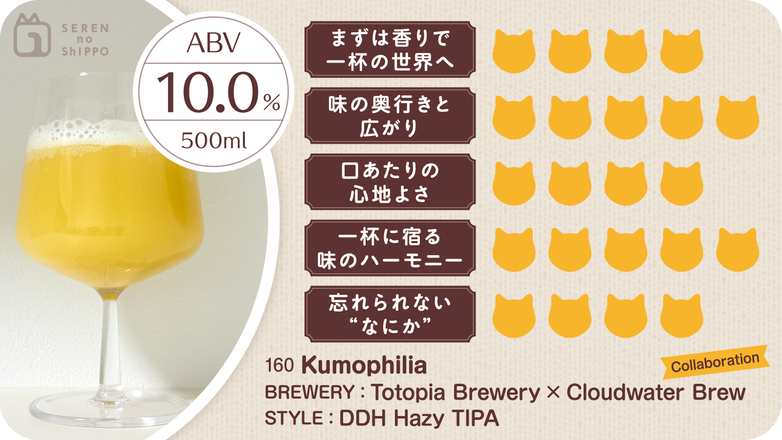 ふらっと立ち寄ったビアショップで「これは外せませんよ」と手渡された一本。ひらめきやジャケ買いも楽しいけれど、人から勧められるビールには不思議な安心感があります。購入したのは、Totopia BreweryとCloudwater Brewによるコラボビール「Kumophilia」。DDH Hazy TIPAという響きだけでも期待は十分。グラスに注ぐ前から、どこか特別な一杯になる予感がしていました。