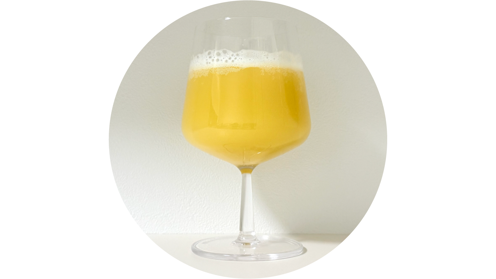 果肉を思わせる明るい黄橙色は、やわらかな光をまとったよう。熟したフルーツの香りがふわりと広がり、その奥から草原を渡る風のようなグラッシーさが顔をのぞかせます。口当たりはとてもなめらかで、密度のある旨味がゆっくりと広がる感覚。控えめな苦味が全体を引き締め、思いのほか後味はすっとクリアに消えていきます。