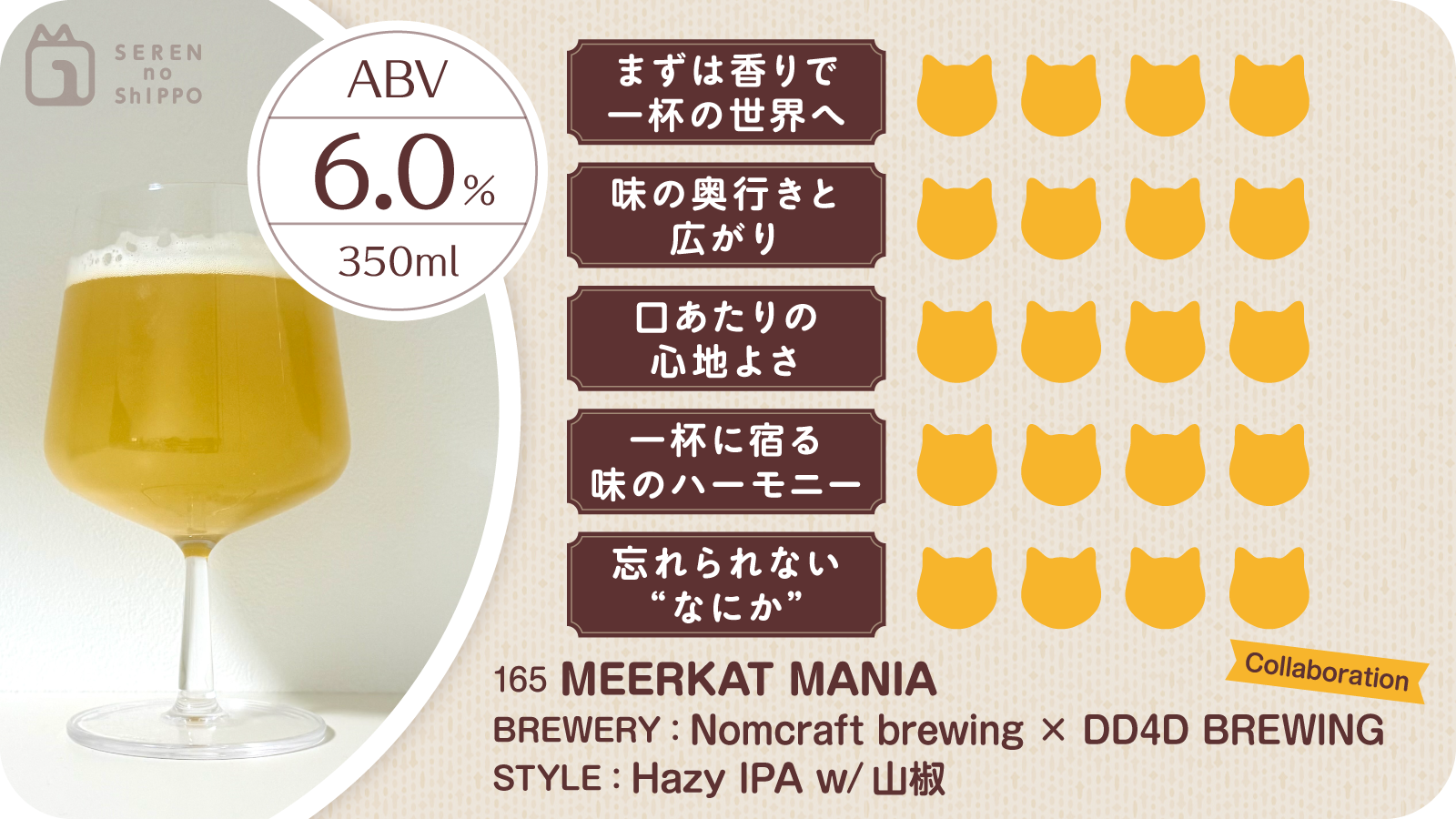 Nomcraft Brewing × DD4D BREWING によるコラボビール MEERKAT MANIA(ミーアキャット・マニア)。スタイルは Hazy IPA w/山椒。ラベルの雰囲気も印象的で、どんな味わいなのか自然と期待が高まります。