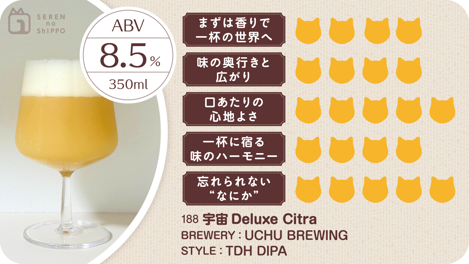馴染みのボトルショップに、食事帰りにふらりと立ち寄った日。今日はしっかり濃い一杯が飲みたい、そんな気分で手に取ったのが、UCHU BREWINGの「宇宙Deluxe Citra(デラックスシトラ)」でした。TDH DIPAという言葉だけで、すでに期待がふくらみます。