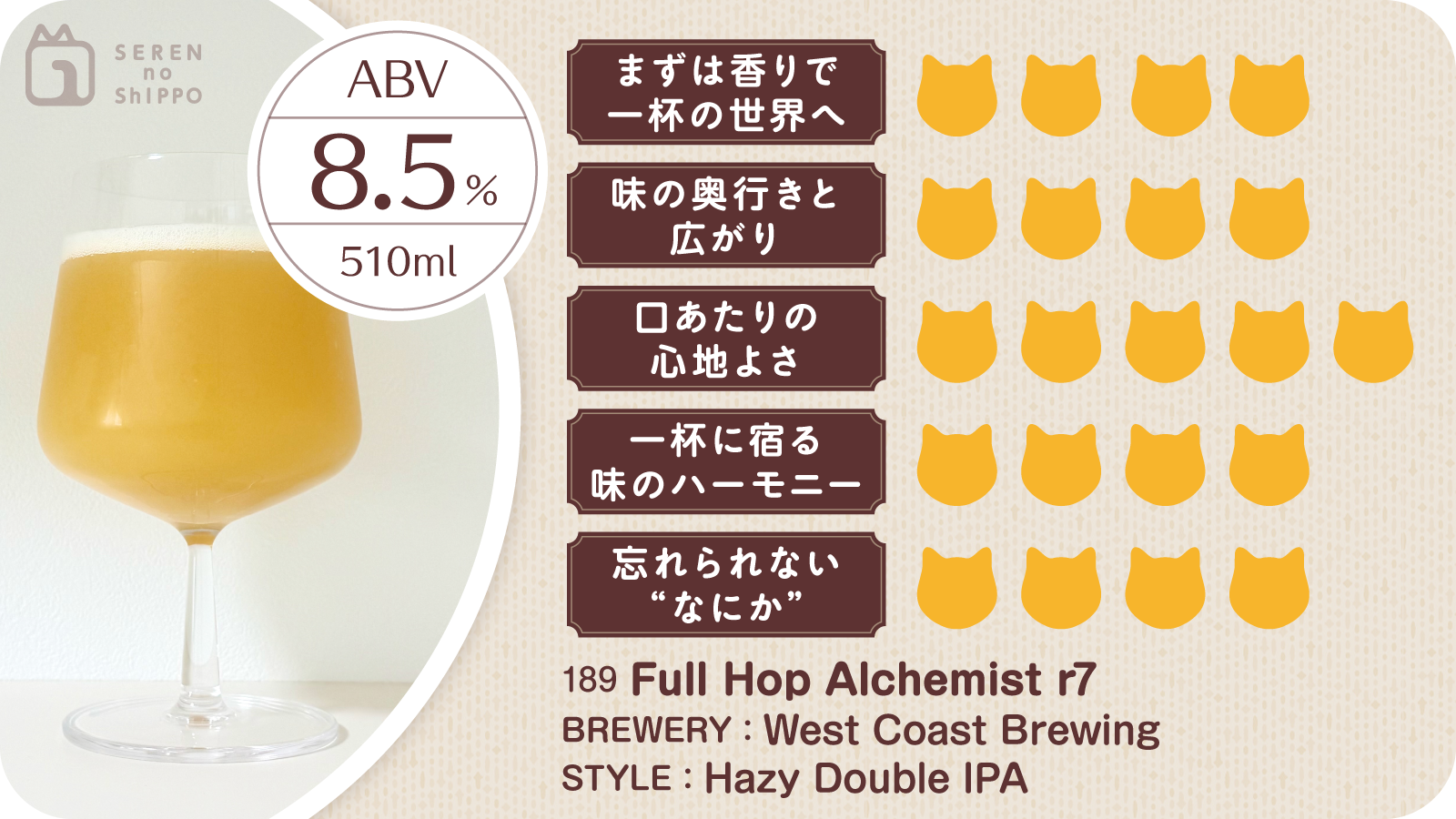 仕事終わり、散歩がてら立ち寄った馴染みのボトルショップ。ふと目に入ったのは、West Coast Brewingの定番シリーズ「Full Hop Alchemist r7(フルホップアルケミスト r7)」。お馴染みの存在ですが、そういえば少し久しぶりかも…そんな気持ちで手に取りました。
