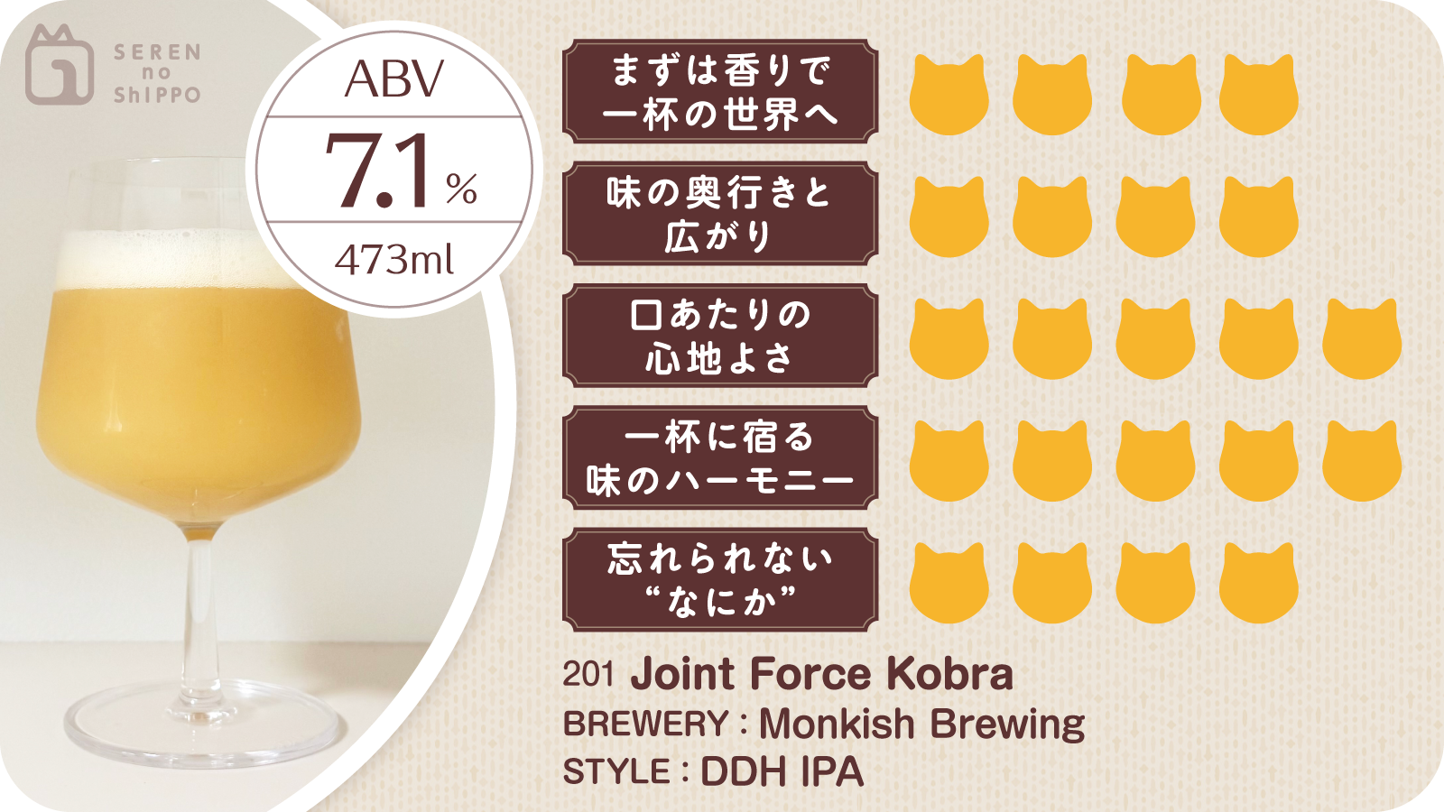 馴染みのボトルショップで、SNSの入荷情報を頼りに手に取ったのは、Monkish Brewingの「Joint Force Kobra(ジョイント フォース コブラ)」。並んだ数本の中から、あえてアルコール度数の低い1本を選ぶ。その夜の最初にふさわしい、静かな期待を連れて。