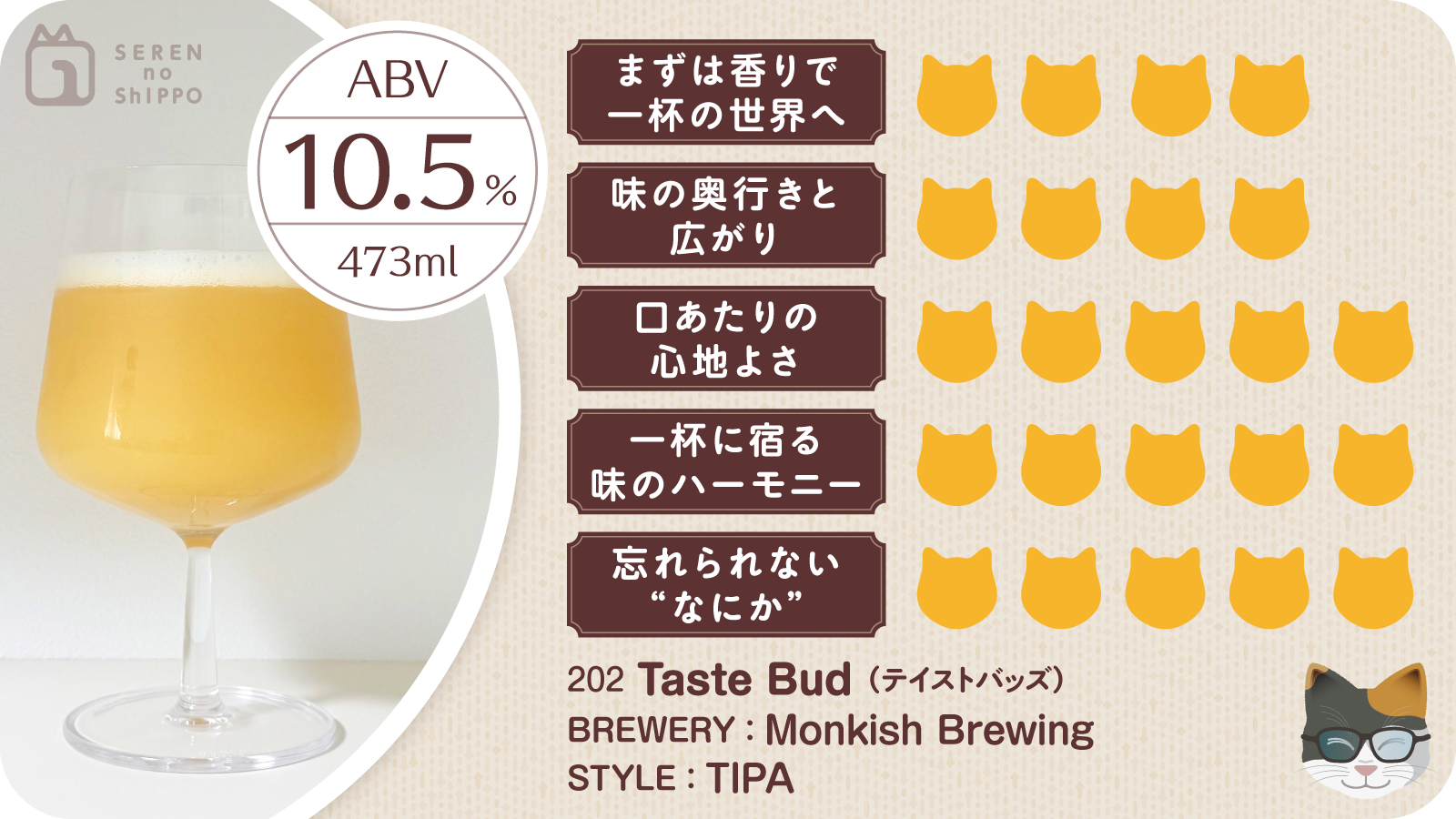 SNSで入荷を見かけて駆けつけた、いつものボトルショップ。選び抜いた中の2本目は、Monkish BrewingのTaste Bud(テイストバッズ)。TIPAらしい濃厚さに期待が高まります。最近はとことん濃いHazyばかり追いかけていて、飽きるどころか、むしろ“その先”を探している感覚です。
