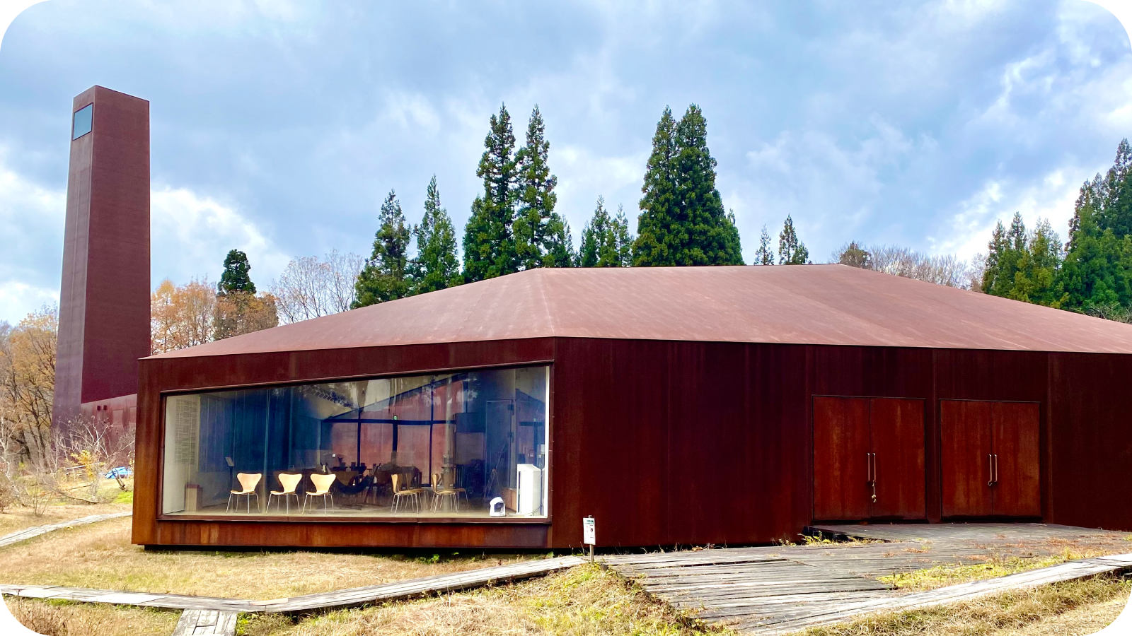 森へ続く道を進むと、木立の向こうに「森の学校」の建物が現れた。まだ開館前の時間帯で、人の気配はほとんどない。木造の外壁には朝の名残りの湿り気が残り、空気の粒を吸いこむたびに、体の内側まで澄んでいくようだった。