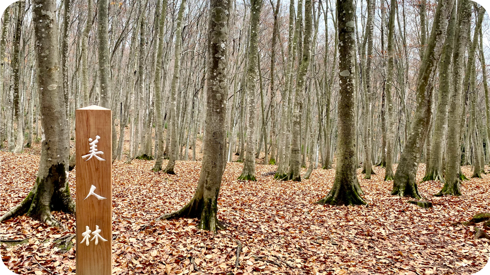 「美人林」という名の通り、枝葉をすらりと伸ばした樹々が並び、そこには“音より先に静けさがある”という不思議な気配が満ちていた。森の入口で立ち止まり、ふと耳を澄ます。葉擦れの音、遠くの鳥の声、地面に落ちるひかり――誰かが整えたわけでもないのに、最初からここに在った“迎え入れる形”が、森の奥へ静かに続いている。